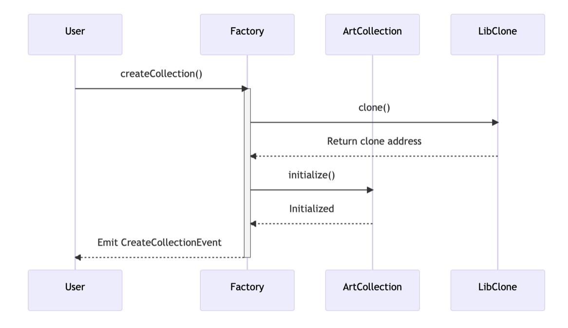 <figure><img src="https://3058407415-files.gitbook.io/~/files/v0/b/gitbook-x-prod.appspot.com/o/spaces%2Ffzuku0m0uwOgwpDG1YgN%2Fuploads%2FQh4DuuDenhVtOtv91ryZ%2FScreenshot%202023-10-10%20at%2012.41.53.png?alt=media&#x26;token=709bf1eb-db63-4686-ade8-ae6b319ffe88" alt=""><figcaption><p><strong>Factory and Collection Contract Integration</strong></p></figcaption></figure>